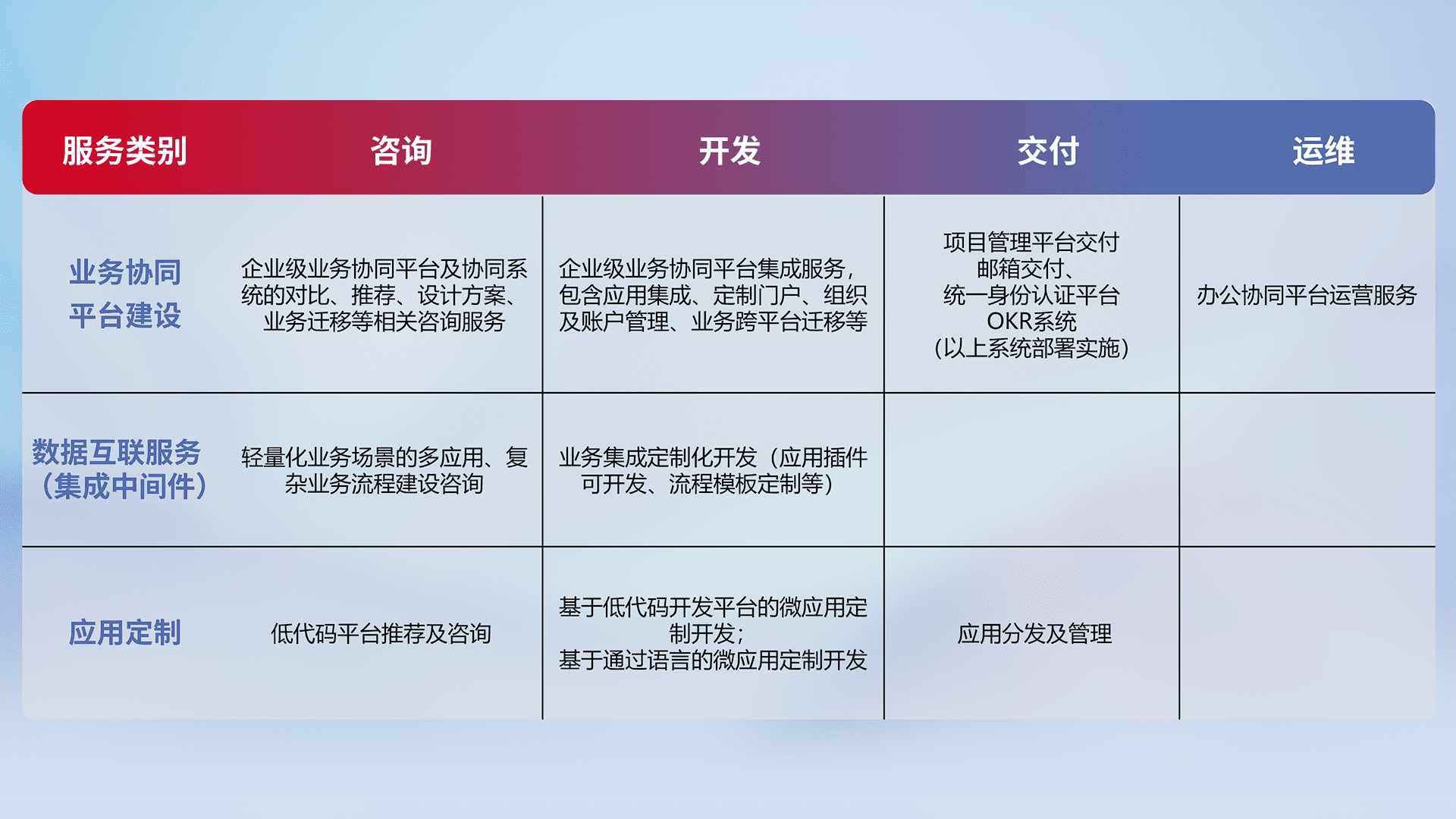 针对钉钉、、企微、、IDaas等平台级产品提供产品的规划、、方案、、交付、、、定制化开发等服务,,实现如统一协同办公、、、智能客户服务、、、混合会议管理、、、、智能数据查询、、、等业务场景,,,,实现数字化转型。。